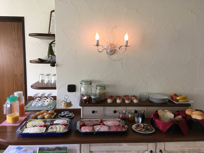 Frisch gebrühter Kaffee oder Tee, knusprige Brötchen und Brot, Aufschnitt, mit viel Liebe hausgemachte Marmeladen, gekochte Eier und vieles mehr steht auf dem Frühstücksbuffet für Sie bereit.